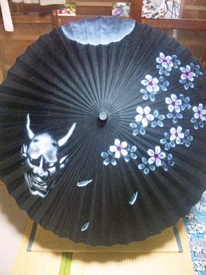 写真はお客様から注文をいただいた般若デザインの蛇の目傘です。